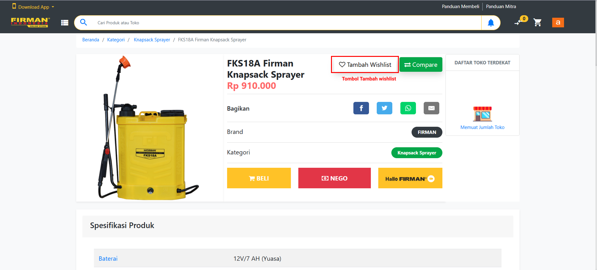 2. Pada halaman info produk, anda dapat melihat detail produk yang ingin dibeli, anda dapat menambahkan kedalam wishlist dengan klik tombol Tambah Wishlist, atau anda dapat membandingkan produk dengan klik tombol Compare, selain itu anda juga bisa melihat spesifikasi produk, suku cadang dan video review. Apabila anda ingin melanjutkan pembelian silahkan klik Tombol Beli.